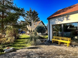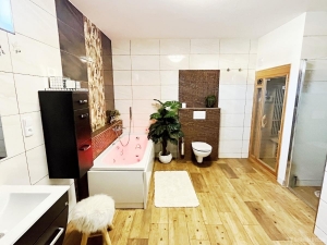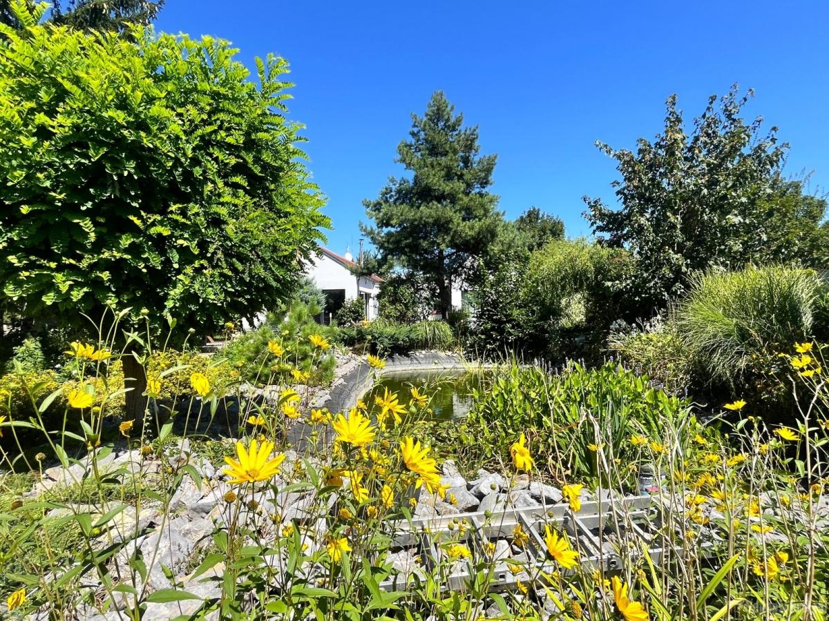 Nabízíme k prodeji samostatně stojící bungalov u lesa s velkým pozemkem. Dům 4+kk je moderní novostavba kolaudovaná v roce 2018. Dům má užitnou plochu 166m2, zastavěnou plochu 201 m2, terasa a zahrada kolem domu pak mají dalších 1392 m2. Jedinečnou výhodou této nemovitosti je její poloha: má pouze jednoho souseda, je v naprosté blízkosti lesa, a přesto se nachází nedaleko (250m) do centra obce. To vše ve spojení s upravenou zahradou s vlastním rybníčkem dodává místu naprostý pocit klidu a soukromí. Dominantou bungalovu je obývací pokoj s kuchyňským koutem a jídelnou o výměře 60 m2. Samozřejmostí jsou 2x WC, spíž, 2x šatna a další vestavné skříně v široké chodbě. Podkroví domu je pochozí a lze ho využít pro uložení věcí. Dům je velmi pěkně a citlivě zařízen (dlažby, podlahy, obložky atd), což umocňuje příjemný pocit z nemovitosti a z bydlení v domě. V koupelně vedle vany naleznete rovněž sprchový kout a infrasaunu. Součástí prodeje je také kuchyňská linka s vestavnými spotřebiči. Na dům navazuje terasa s bazénem s protiproudem a okrasná, upravená zahrada s rybníčkem. Součástí prodávané nemovitosti je zahradní domek, sklep a také velké kryté stání pro 2 auta. Příjezd na nemovitost je rovněž ze zadní strany pozemku. NASTĚHOVÁNÍ MOŽNÉ IHNED. Babice nad Svitavou mají výbornou dostupnost do Brna jak autem - 14 km autem do Maloměřic, tak i veřejnou dopravou – ca 30-35 min. na Hlavní nádraží do centra. V obci je obchod, restaurace, 2x školka, škola a bohatý spolkový život. Nemovitost doporučuji všem, kteří hledají moderní samostatně stojící RD s velkou zahradou v bezprostřední blízkosti lese.